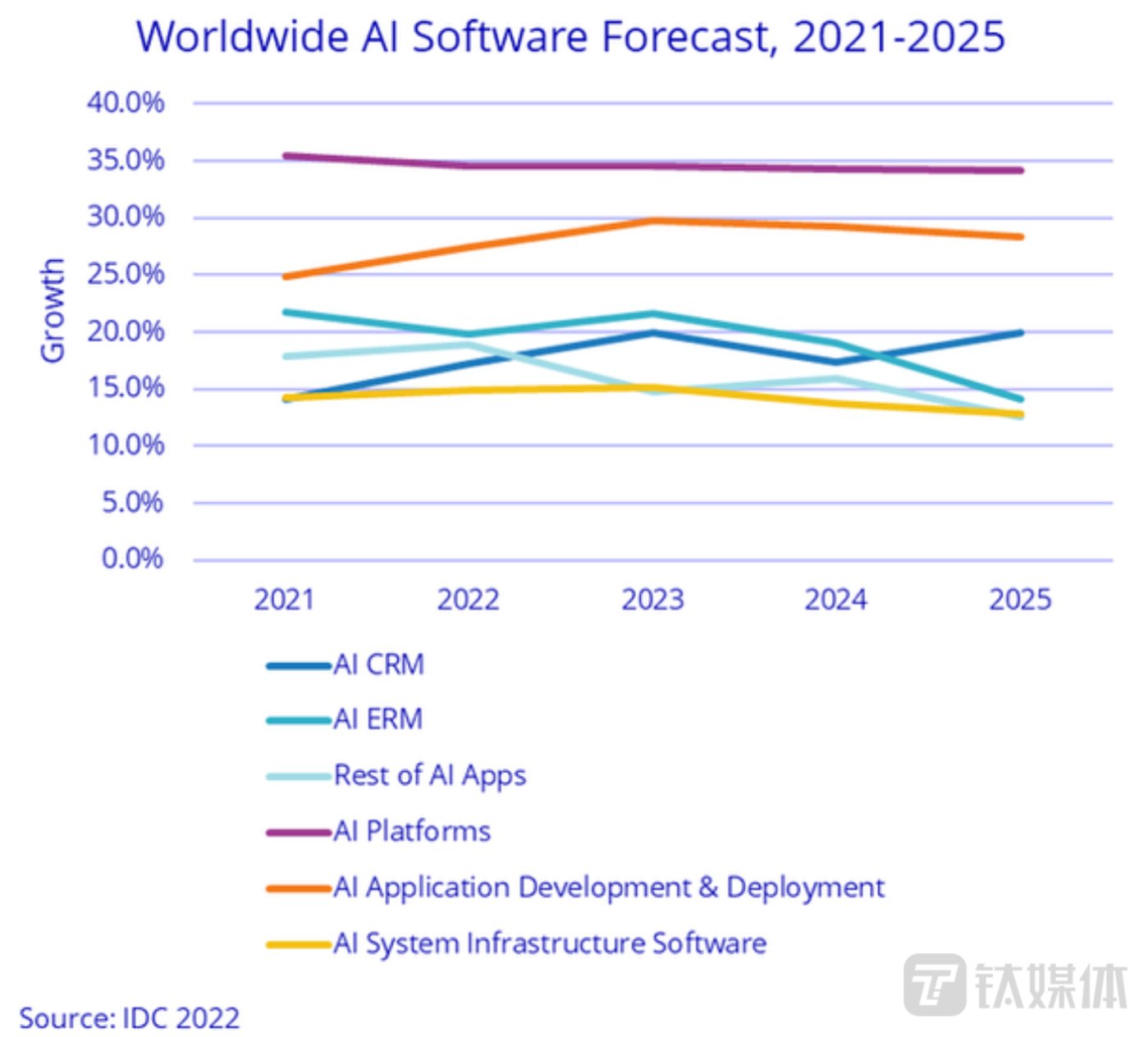 据IDC统计,全球人工智能收入预计到2022年同比增长19.6%,达到4328亿美元,包括软件、硬件和服务。并预计2023年将突破5000亿美元大关。在增长方面,人工智能平台预计表现最佳,五年复合年增长率为34.6%。
