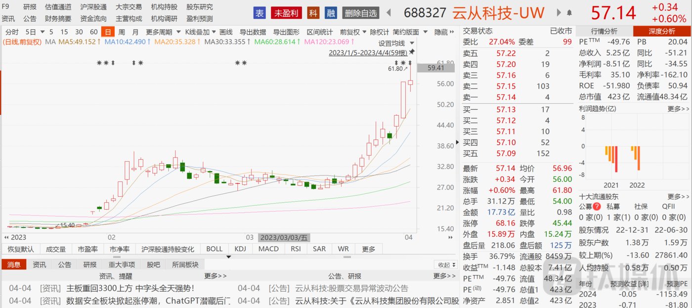 然而公司这份自我“降温”公告,并没能挡住二级市场对其投资的热情。4月4日,云从科技盘中下跌超4%,随后震荡反弹超8%,收涨0.6%,截至收盘报收57.14元,总市值423亿元。