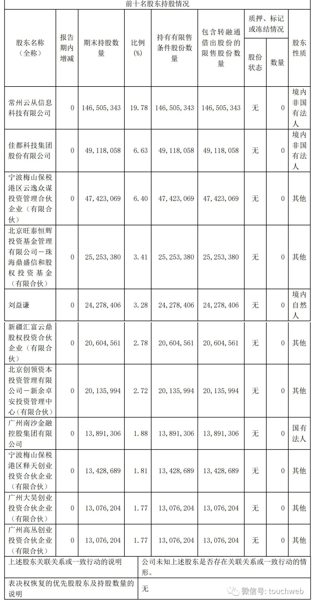 截至2023年3月31日,常州云从信息科技有限公司持股为19.78%,佳都科技集团股份有限公司持股为6.63%,宁波梅山保税港区云逸众谋投资管理合伙企业(有限合伙)持股为6.4%,北京旺泰恒辉投资基金管理有限公司-珠海鼎盛信和股权投资基金(有限合伙)持股为3.41%;