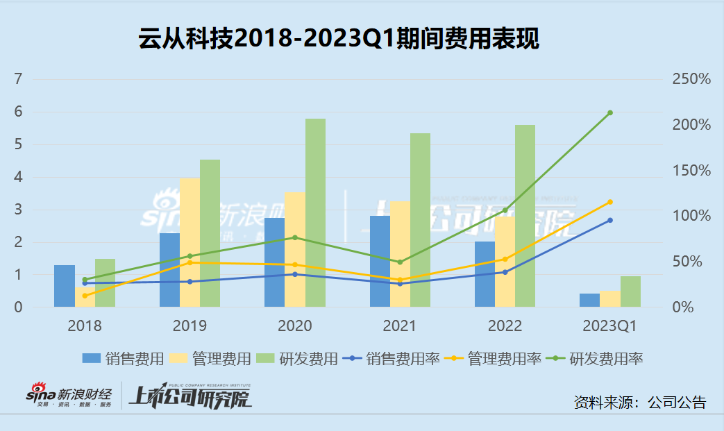 尽管收入与盈利表现并不乐观,但云从科技的期间费用却始终高企。2022年,销售费用、研发费用与管理费用分别为2.03亿元、5.60亿元与2.78亿元,其中销售费用与管理费用相比去年同期有所减少,而研发费用同比增长4.90%。由于2022年与2023年Q1收入的大幅下滑,期间费用率明显上涨,2022年三费收入比率合计为197.91%,2023年一季度则高达424.44%,已经远超云从科技当前的收入能力。