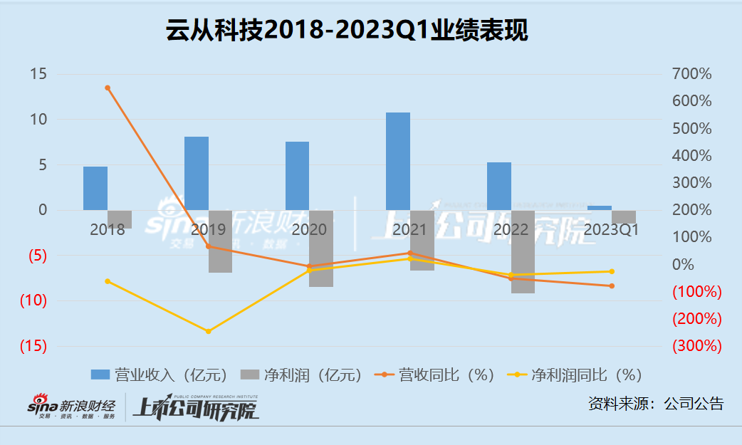 2020-2023年第一季度,云从科技实现营业收入分别为7.55亿元、10.76亿元、5.26亿元与0.45亿元,同比增长率分别为-6.51%、42.49%、-51.06%与-78.72%,而2018与2019年,云从科技的增长幅度则分别为650.17%与66.77%,可以看出,高歌猛进的增长态势并未能长期保持,2022年云从科技的营收规模腰斩,而2023年一季度也并未好转。