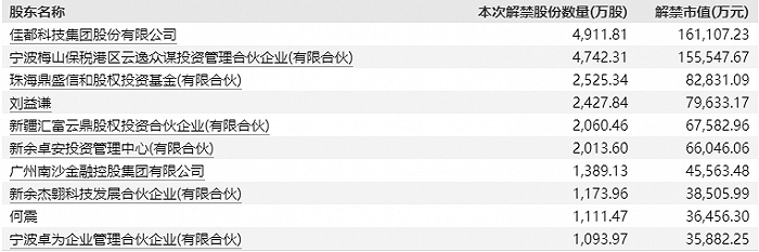 解禁数量超过1亿股的公司4家,分别为云从科技-UW、三峡水利(600116.SH)、云南铜业(000878.SZ)、华银电力(600744.SH)。