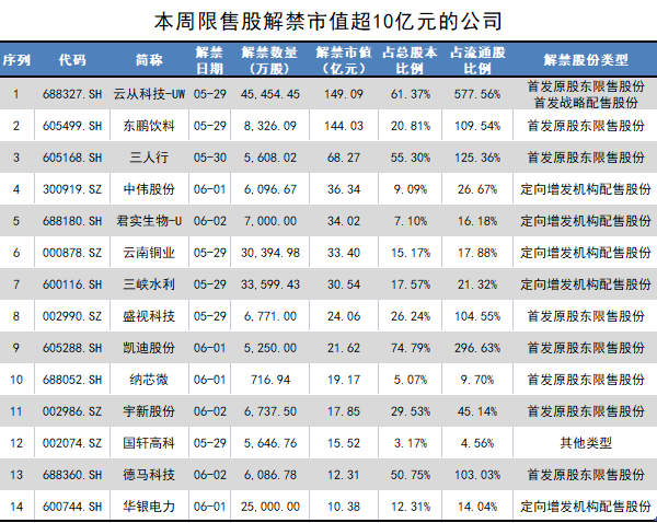 本周解禁市值超过10亿元的公司有14家,云从科技-UW(688327.SH)、东鹏饮料(605499.SH)两家公司解禁市值均超过140亿元,三人行(605168.SH)解禁市值超过60亿元。