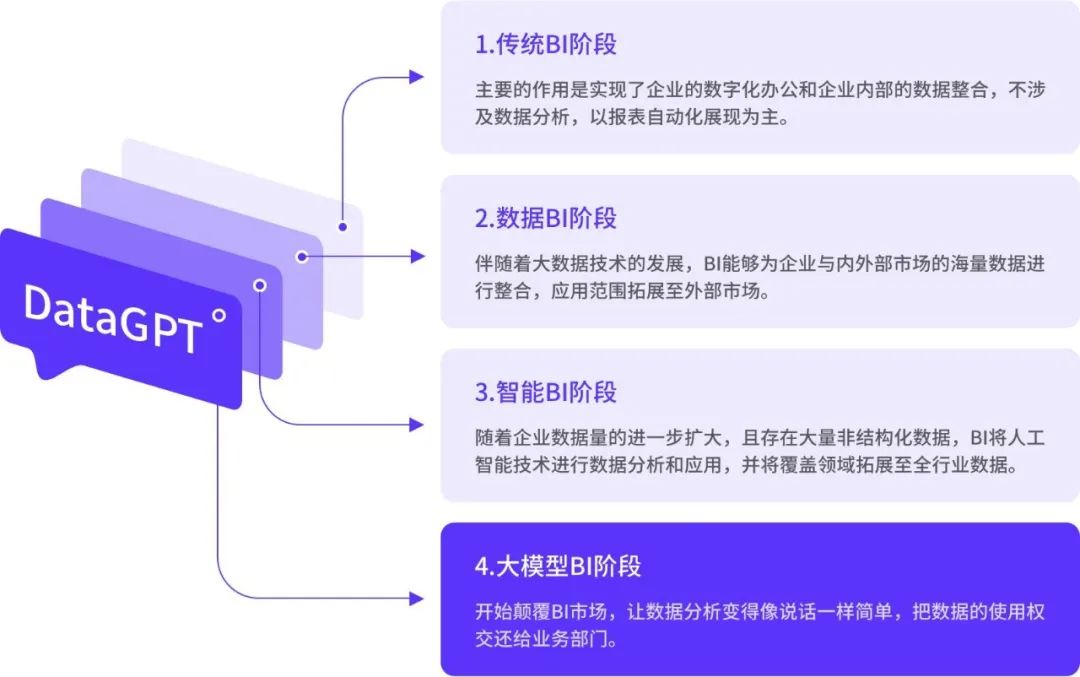 前三个阶段逐步降低报表生成门槛,提高报表生成效率。云从科技DataGPT的推出开创了BI应用新时代,依托从容多模态大模型,DataGPT以卓越的跨模态理解、生成和推理能力,以及海量知识库支撑,高效精准地响应用户提出的任何数据问题,成功打破数据分析的技术壁垒,使业务部门能够更直接地获取并利用数据价值,显著提升工作效率。