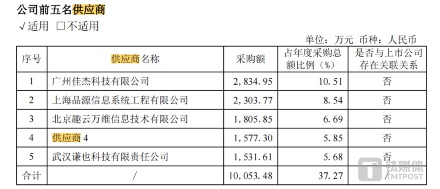 另据财报显示,公司采购内容主要分为非生产性物资和生产性物资。而公司前五名供应商采购额超1亿元,占年度采购总额37.27%。与去年同期前五名供应商相比,供应商一、二、三、五为新增供应商。不过,公司与第五大供应商武汉谦也科技有限责任公司(下称“谦也科技”)超1500万元交易值得关注。