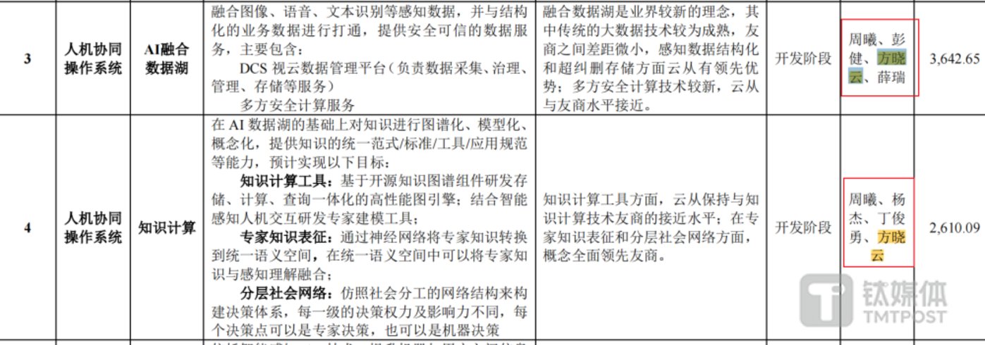 而在公司重点研发项目之中,人机协同操作系统中—“知识计算”和“AI融合数据湖”两个项目值得注意。截至2023年末,上述两个研发项目已经结项,其中研发人员显示为周曦、杨杰、丁俊勇、方晓云等。