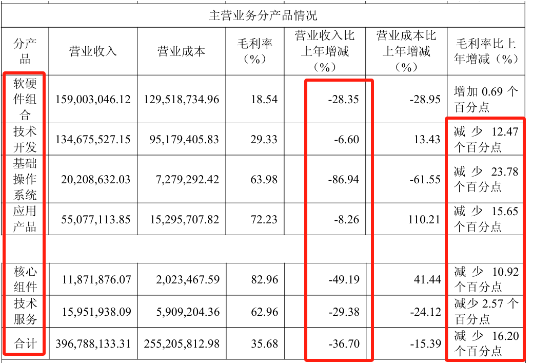 分产品来看,2024年,云从科技软硬件组合、技术开发、基础操作系统及应用产品等各大类别中,除软硬件组合产品毛利微增0.69%外,其余产品毛利率均全部下滑,且营收全面同比下滑。