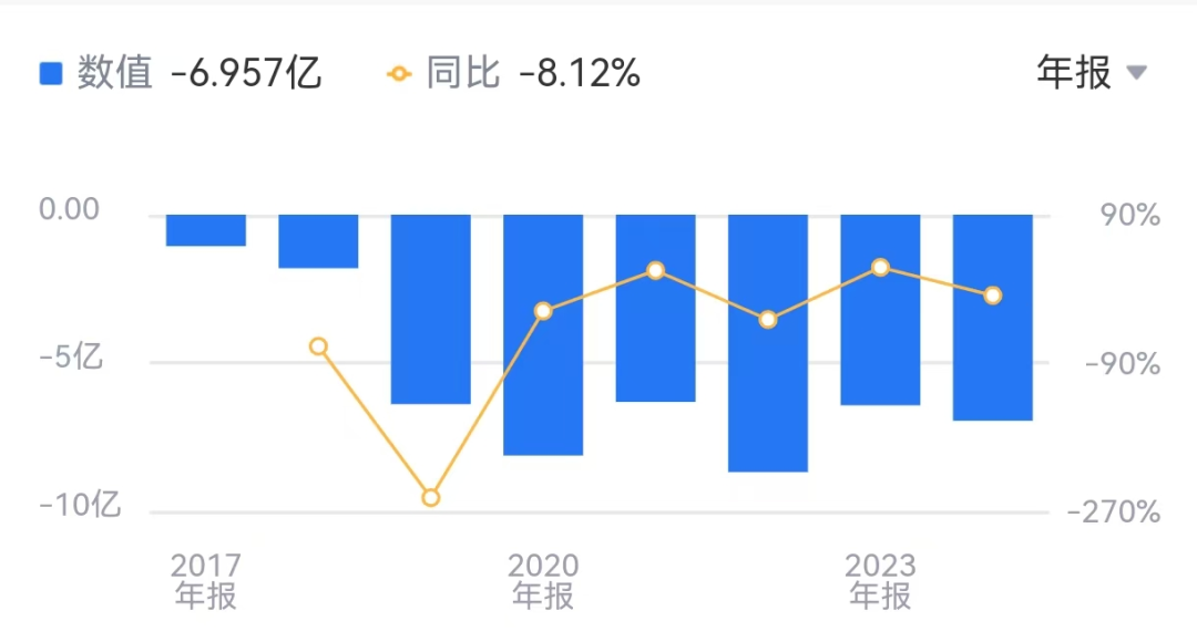 在净利润表现方面,2024年度,云从科技归母净利润约-6.96亿元,亏损同比扩大8.12%。这是公司财报披露以来连续第8年亏损,累计亏损额超45.79亿元,且亏损额度不见缩小。