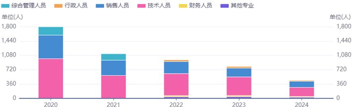 此外,云从科技近五年的人员数据,也呈现出持续缩水的态势:2020年至2024年,公司员工总数从1799名锐减至453名,研发人员数量从997名腰斩至228名,研发团队规模五年内缩减超七成。人员流失的负面影响在2025年初进一步显现,1月13日,核心技术人员张岭因个人原因辞职,使得公司核心技术人员从3人减至2人。