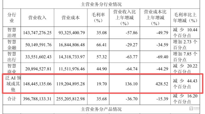 业务结构的畸形化,是其战略被动的直接体现。2024年数据显示,公司五大业务板块中,仅泛AI领域及其他业务实现增长,收入1.48亿元,同比增幅达136.10%,成为营收主力。但这份增长的代价是毛利率的大幅下滑:该业务毛利率仅为19.70%,同比骤降44.43个百分点,远低于公司整体35.68%的毛利率水平。