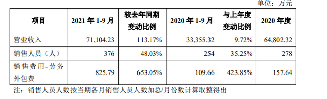 公司2021年1-9月营业收入、销售人员人数以及计入销售费用的劳务外包费分别较2020年1-9月增长113.17%、48.03%和653.05%。根据公司披露的2021年年度业绩快报,公司2021年度实现的营业收入为91,124.63万元,较上年增长40.62%,营业收入与销售人员人数的变动情况相匹配。