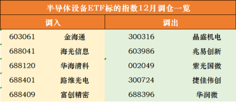 消息面上,近期半导体设备ETF标的指数迎来12月份调仓换股,新纳入金海通、海光信息、华海清科、路维光电以及富创精密等5股,剔除了晶盛机电、兆易创新、紫光国微、捷佳伟创、华润微等5股,通过不断的吐故纳新,为指数源源不断地置入优质资产。