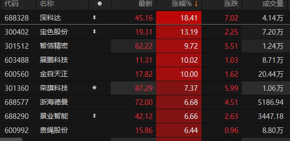 12月11日早盘,申万一级行业板块中,机械设备板块探底回升。截至9时59分,深科达涨超18%,宝色股份涨逾13%,智信精密涨逾9%,荣旗科技、浙海德曼、景业智能等跟涨。此前,展鹏科技、金自天正涨停