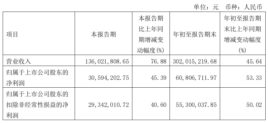 其中,第三季度艾隆科技实现营业收入1.36亿元,同比增长76.88%;实现归母净利润3059.42万元,同比增长45.39%。