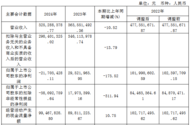 2024年,公司实现营业收入3.25亿元,同比下降10.52%;归属于上市公司股东的净利润为-2,170.34万元,上年同期为2,952.20万元;归属于上市公司股东的扣除非经常性损益的净利润为-3,809.28万元,上年同期为1,797.34万元;经营活动产生的现金流量净额为9,946.78万元,同比增长10.75%。