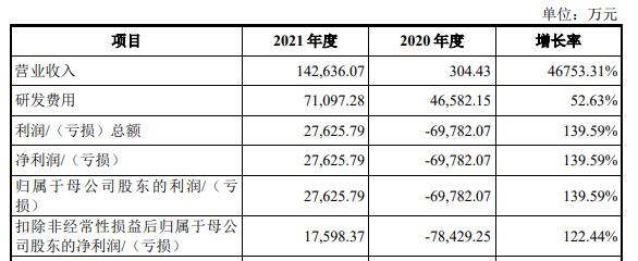 2021年,荣昌生物营业收入为142,636.07万元,同比增长46753.31%;归属于母公司股东的利润27,625.79万元,同比增长139.59%;扣除非经常性损益后归属于母公司股东的净利润17,598.37万元,同比增长122.44%。