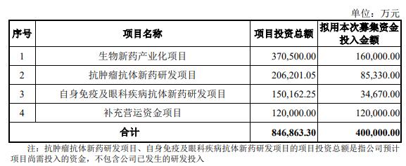公司实际募资净额较原拟募资少15亿元。荣昌生物2022年3月28日披露的招股书显示,公司拟募集资金40亿元,分别用于生物新药产业化项目、抗肿瘤抗体新药研发项目、自身免疫及眼科疾病抗体新药研发项目、补充营运资金项目。