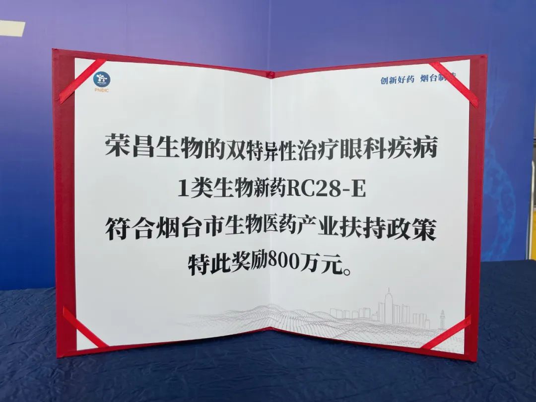 8月18日,2022医药创新与发展国际会议在烟台八角湾国际会议中心隆重开幕。会上兑现政策扶持奖励,由荣昌生物自主研发、治疗眼科疾病的全球首创VEGF/FGF双靶标融合蛋白药物RC28获得800万元奖励,市委副书记、市长郑德雁颁奖,公司总裁傅道田上台领奖。这是继去年获得烟台6000万元创新发展扶持资金之后,荣昌生物获得的又一笔重奖。