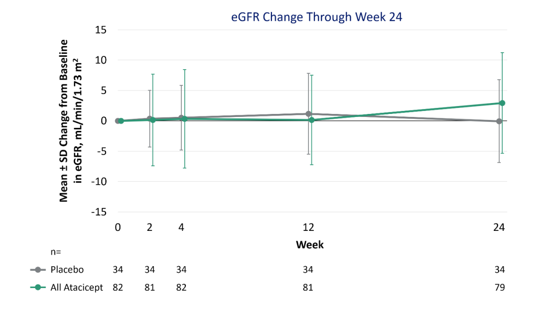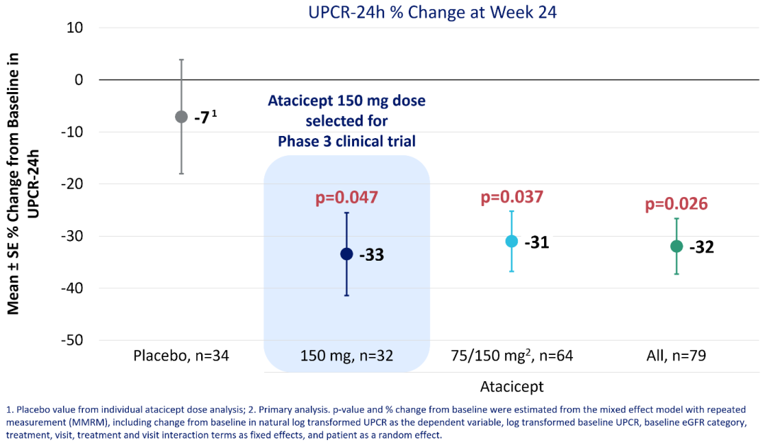 研究结果表明,合并75/150mg剂量组在第24周时通过UPCR评估的蛋白尿变化与基线相比平均降低31%(p=0.037);150mg剂量组的蛋白尿水平与基线相比减少33%(p=00.047)(图1)。第36周时,与安慰剂相比,全阿塞西普组都观察到蛋白尿的进一步减少(图2);eGFR变化稳定(图3);GD-IgA1持续降低(图4)。安全性、耐受性良好。