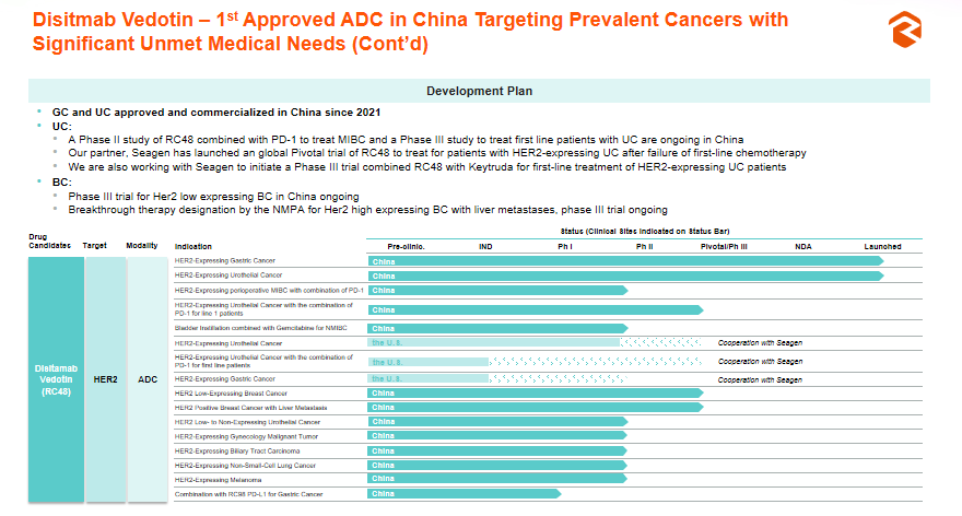 维迪西妥单抗是一款抗HER2抗体偶联药物(ADC),也是首款获批的由中国公司自主研发的ADC产品。该药已经在我国获批用于单药治疗HER2过表达局部晚期或转移性胃癌(GC)及尿路上皮癌(UC)。2021年8月,国际知名生物制药公司Seagen以2亿美元首付款和最高可达24亿美元的里程碑付款、外加超过百分之十几的梯度销售提成获得了维迪西妥单抗的全球(亚太区除外)独家许可协议,交易额一度刷新中国制药企业单品种海外授权的最高纪录。