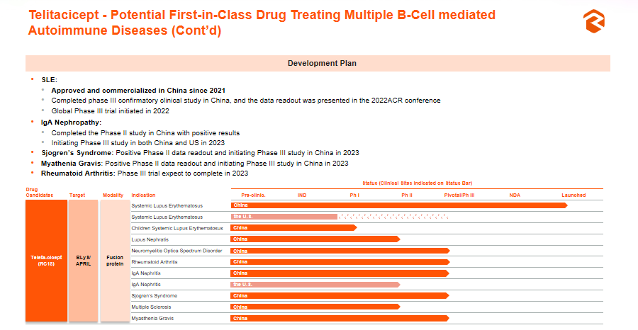 房博详细介绍了两款重磅产品的具体情况。其中,泰它西普是公司自主研发的全球首款、同类首创(first-in-class)的注射用重组B淋巴细胞刺激因子(BLyS)/增殖诱导配体(APRIL)双靶点的新型融合蛋白产品,可同时抑制BLyS和APRIL两个细胞因子与 B 细胞表面受体的结合,“双管齐下”阻止 B 细胞的异常分化和成熟,从而治疗自身免疫性疾病,该药已经在我国获批上市,用于治疗系统性红斑狼疮。此外,泰它西普已于2022年启动针对SLE的全球Ⅲ期临床试验;针对IgA肾病、干燥综合征、重症肌无力等适应症的Ⅱ期临床研究取得阳性结果,正在或即将于中国和美国启动Ⅲ期临床研究。
