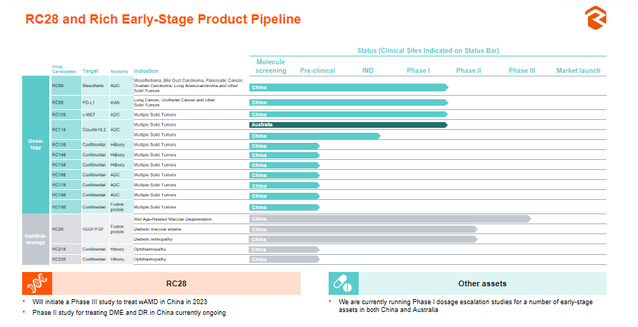 RC28是荣昌生物开发的用于治疗眼科疾病的全球首创VEGF/FGF双靶标融合蛋白药物,可同时阻断VEGF和FGF家族的血管生成因子,从而更有效地抑制血管异常生长。该药治疗糖尿病黄斑水肿(DME)和糖尿病视网膜病变(DR)的Ⅱ期临床研究正在进行中,治疗湿性年龄相关性黄斑变性(wAMD)的中国Ⅲ期临床研究即将启动。