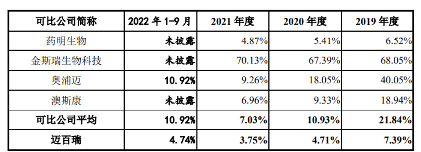 从主营业务毛利率来看,报告期内,公司主营业务毛利率分别为10.96%、22.41%和33.5%,虽呈逐年上升趋势,但同期同行业可比公司毛利率平均水平基本在45%至60%之间,高于迈百瑞近30个百分点。对此,迈百瑞解释称,主要是产品或服务类型、收入结构占比等因素不同导致。