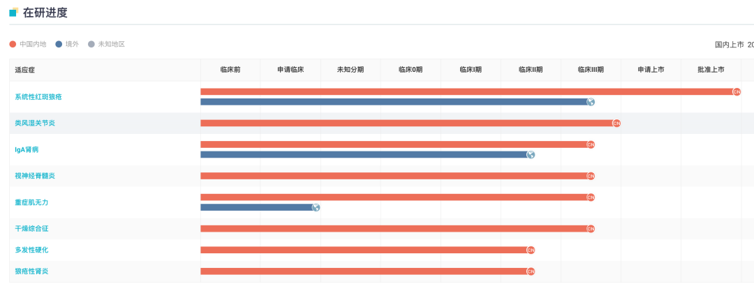 除系统性红斑狼疮以及 IgA 肾病外,泰它西普治疗类风湿性关节炎、重症肌无力、原发性干燥综合征、视神经脊髓炎谱系疾病、多发性硬化等适应症的Ⅱ/Ⅲ期临床研究也在推进中。