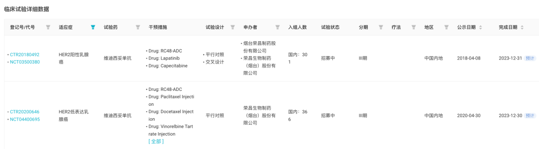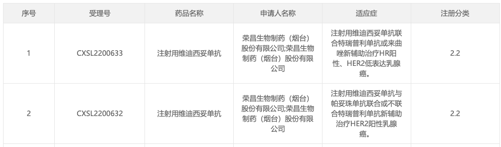 3月15日,据 CDE 官网显示,荣昌生物 RC48 /维迪西妥单抗获批两项乳腺癌新临床试验,分别为: