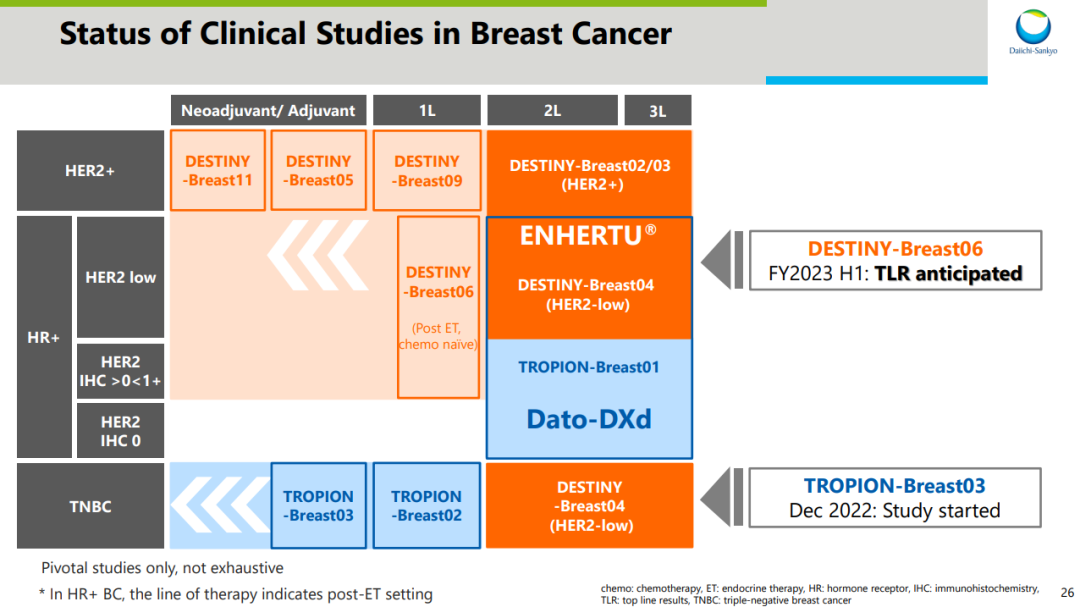 而基于德曲妥珠单抗此前亮眼的数据,第一三共在乳腺癌领域开启了全面布局,覆盖 HER2 阳性群体及 HER2 低表达群体的各线治疗,欲逐渐取代既往标准疗法,实现 HER2 靶向治疗的制霸。当然,也包括此次荣昌开展的两项适应症。