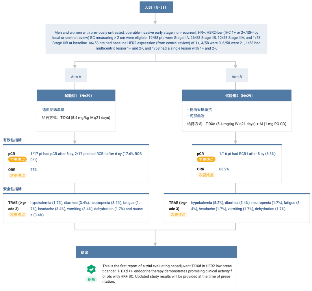 研究纳入既往未接受过治疗,癌灶为可手术的早期浸润性、非复发性病灶,分子亚型为 HR+/HER2 低表达(IHC 1+或 IHC 2+/ISH-),病灶 2 cm 的患者。主要终点为为患者手术时的 pCR 率(ypT0/is ypN0)。研究共纳入 58 名受试者。