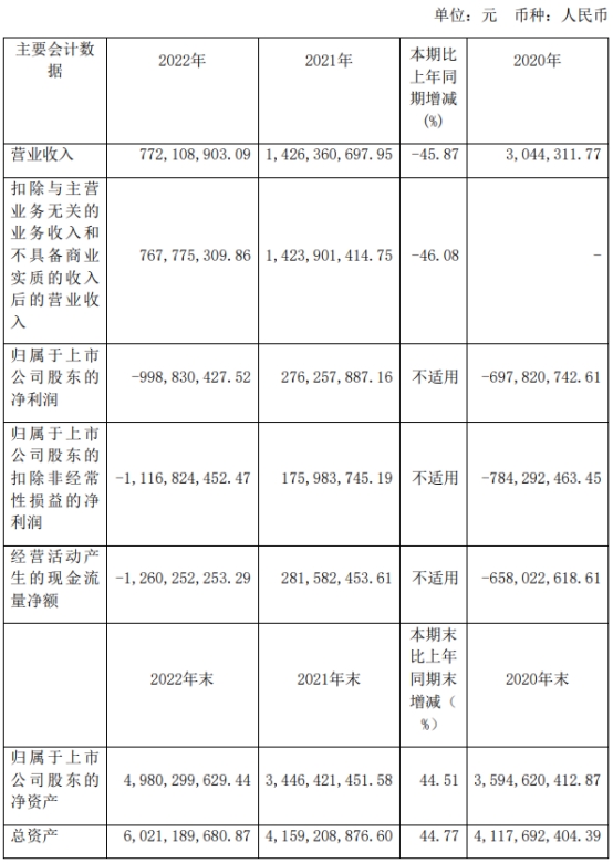 中国经济网北京3月30日讯荣昌生物(688331.SH)于昨日晚间发布2022年年度报告,公司2022年实现营业收入7.72亿元,同比下降45.87%;归属于上市公司股东的净利润为-9.99亿元,上年同期为2.76亿元;归属于上市公司股东的扣除非经常性损益的净利润为-11.17亿元,上年同期为1.76亿元;经营活动产生的现金流量净额为-12.60亿元,上年同期为2.82亿元。