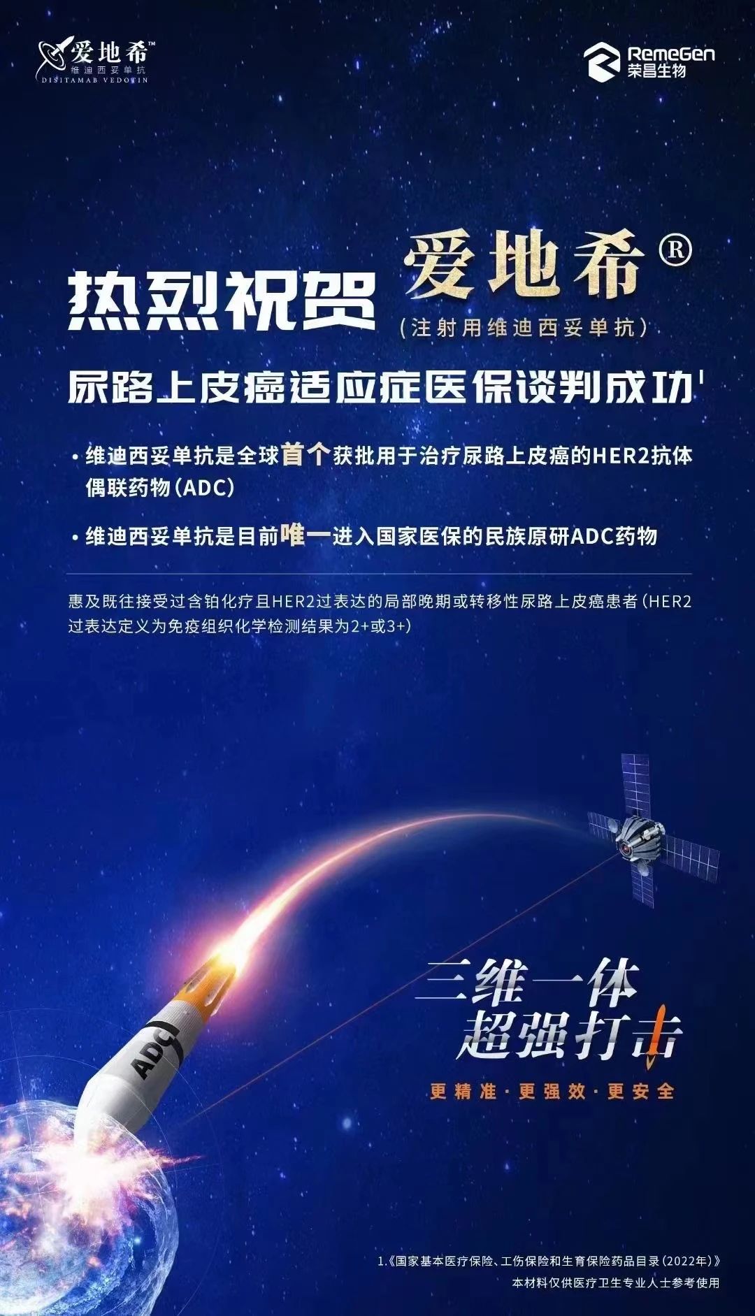 1月19日,经国家医保谈判,由荣昌生物制药(烟台)股份有限公司(688331.SH/09995.HK)自主研发的国内首个原研抗体偶联药物(ADC)注射用维迪西妥单抗(研发代号:RC48,商品名:爱地希)新适应症被纳入《国家基本医疗保险、工伤保险和生育保险药品目录(2022版)》乙类部分,适用于既往接受过含铂化疗且HER2过表达的局部晚期或转移性尿路上皮癌患者。至此,维迪西妥单抗胃癌、尿路上皮癌两项已获批上市适应症均被纳入国家医保药品目录。