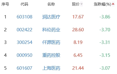 润达医疗、科伦药业、仟源医药、重药控股、上海医药位列涨幅榜后五位,涨幅分别为-3.86%、-3.70%、-3.31%、-3.15%、-3.07%。