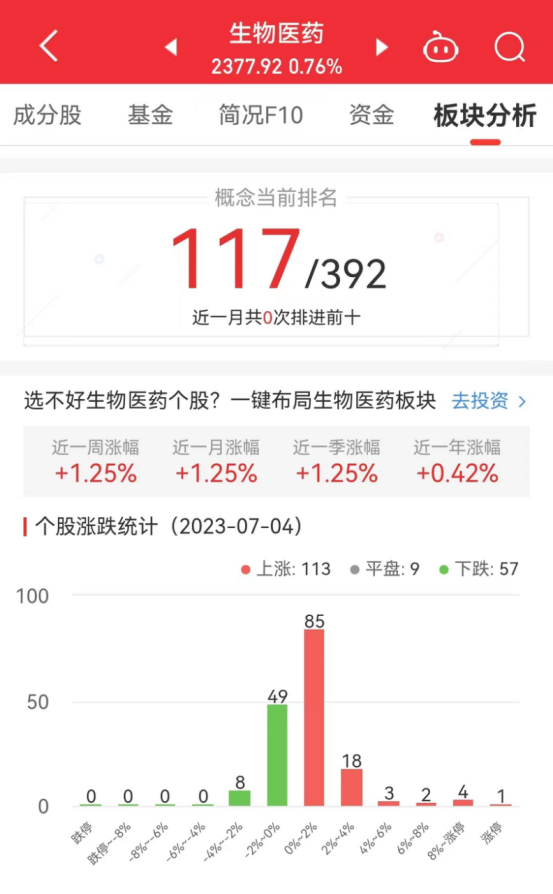 中国经济网北京7月4日讯今日,生物医药板块整体涨幅0.76%,其中113只股票上涨,9只股票平盘,57只股票下跌。