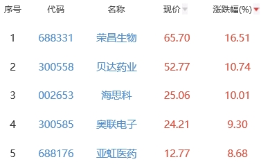 其中,荣昌生物、贝达药业、海思科、奥联电子、亚虹医药位列板块涨幅前五位,涨幅分别为16.51%、10.74%、10.01%、9.30%、8.68%。