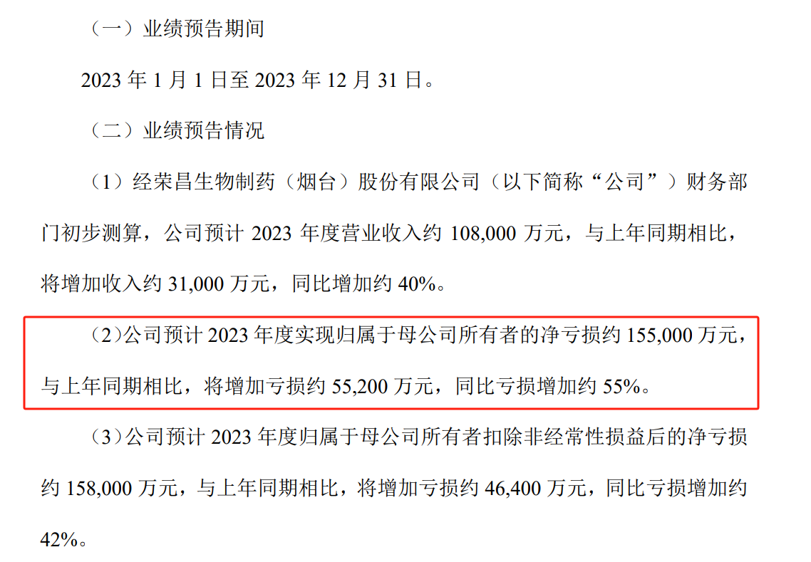 公告显示,荣昌生物预计2023 年度实现归属于母公司所有者的净亏损约 155,000 万元,与上年同期相比,将增加亏损约 55,200 万元,同比亏损增加约 55%。