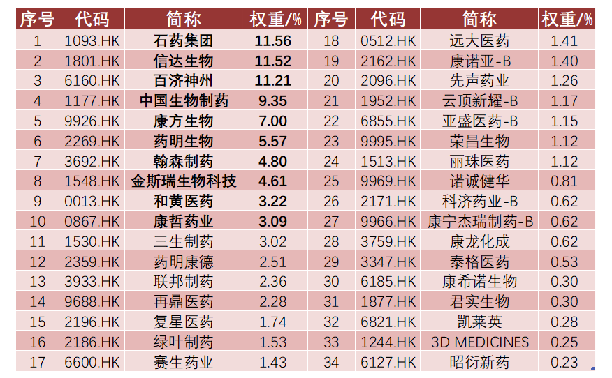$港股通创新药ETF(SZ159570)$跟踪的指数国证港股通创新药指数(987018)的全部持仓股和对应的权重,具体如下: