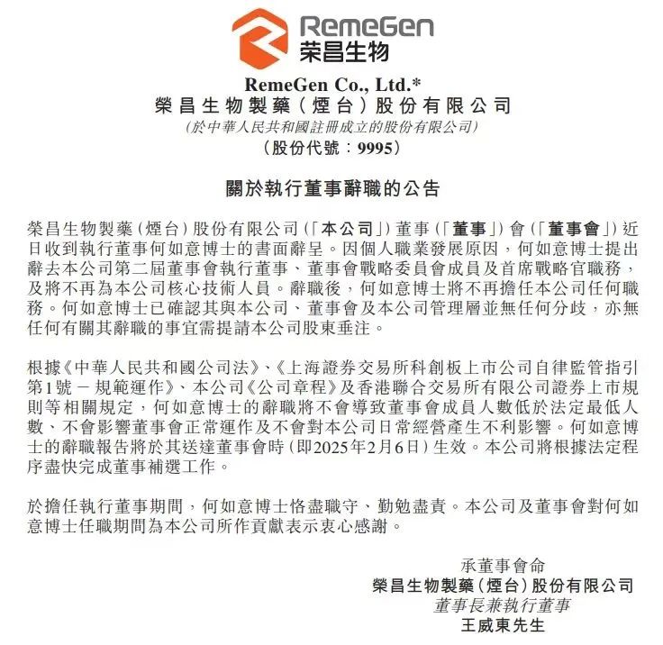 2025年2月6日,荣昌生物发布公告:公司执行董事暨核心技术人员何如意先生因个人职业发展原因于近日申请辞去公司第二届董事会执行董事、战略委员会委员及首席战略官的职务,并不再担任公司核心技术人员。