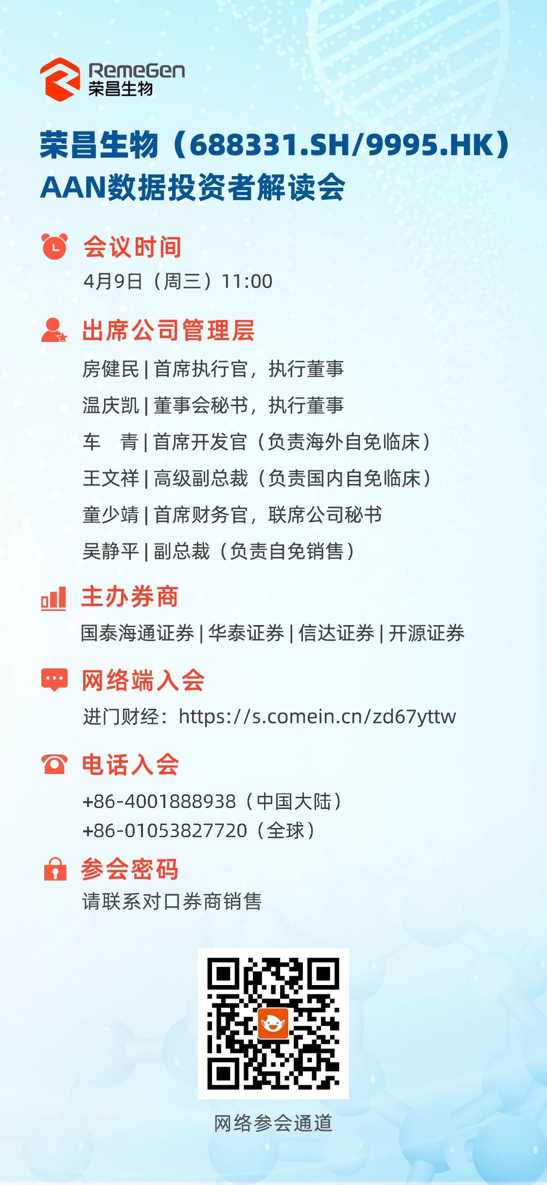 北京时间2025年4月9日上午,将举行荣昌生物(688331.SH/09995.HK)AAN数据投资者解读会,诚邀阁下或贵机构代表参加。