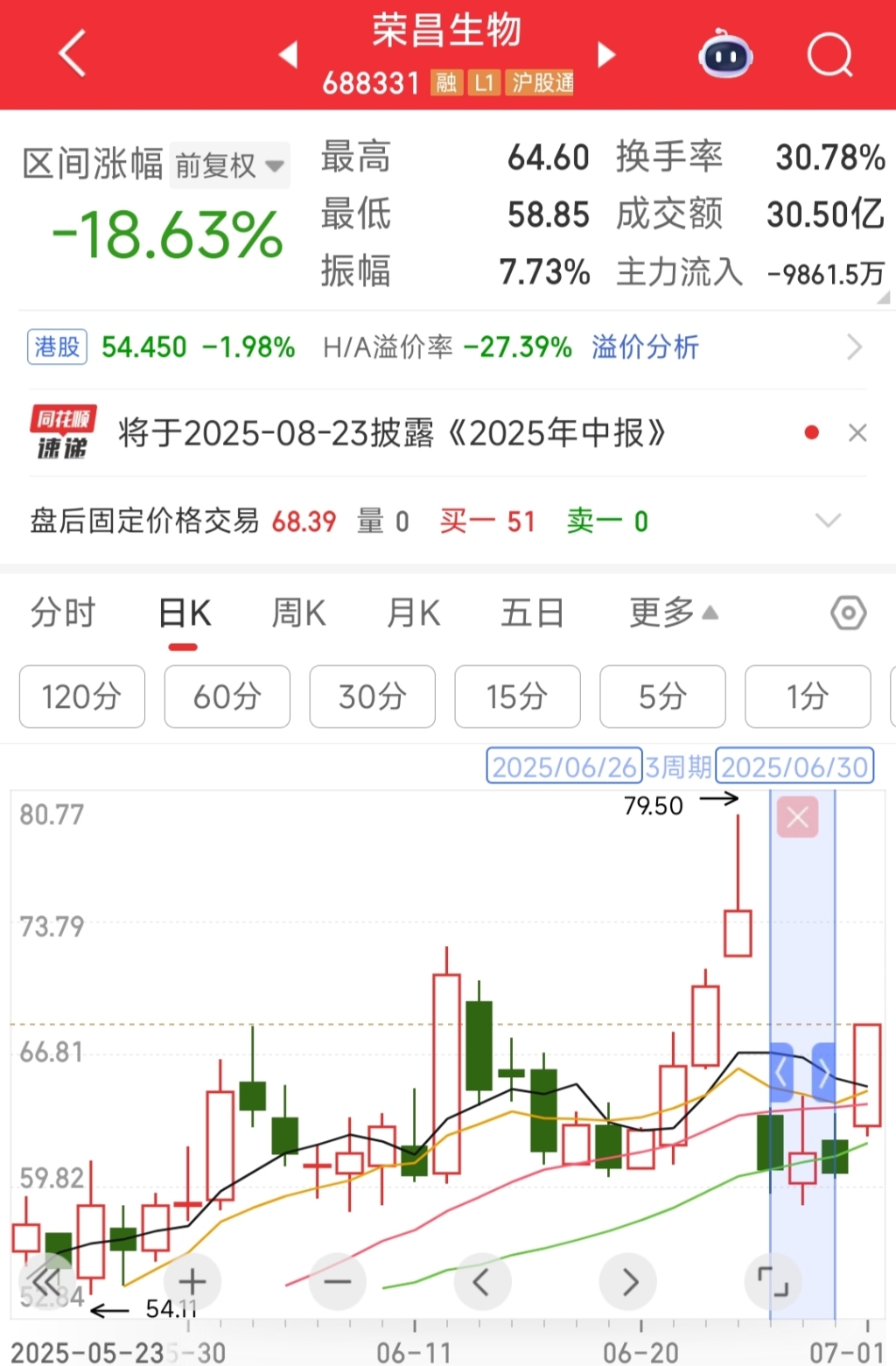 作为“A+H”两地上市的创新药企,荣昌生物A股(688331.SH)当日收涨13.04%,报68.39元/股。然而,与之形成鲜明对比的是,花旗发布研报,将荣昌生物港股(09995.HK)评级由“买入/高风险”下调至“沽售/高风险”,目标价维持32港元不变(“沽售”即建议卖出)。由于香港假期,港股当日休市,前一交易日(6月30日)荣昌生物H股收报54.45港元/股,下跌1.98%。