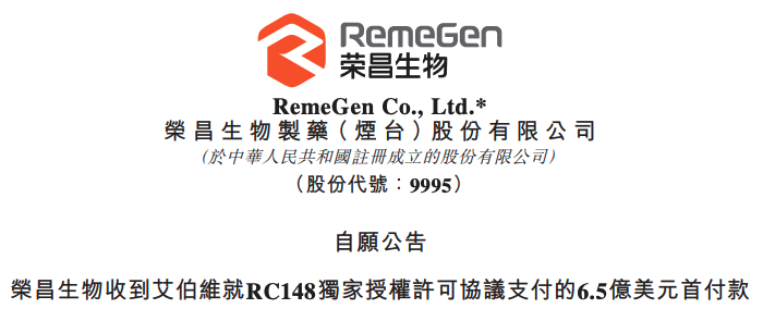 4 月 15 日,荣昌生物发布公告,已就 RC148 的独家授权许可协议从艾伯维收到 6.5 亿美元的首付款。