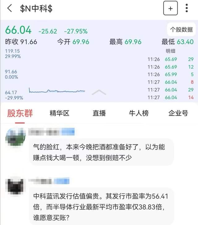 中科蓝讯发行价为91.66元/股,按中签一手(500股)计算,中签的股民最高浮亏超1.4万元。即使以午间收盘价卖出,也将浮亏约1.2万元。