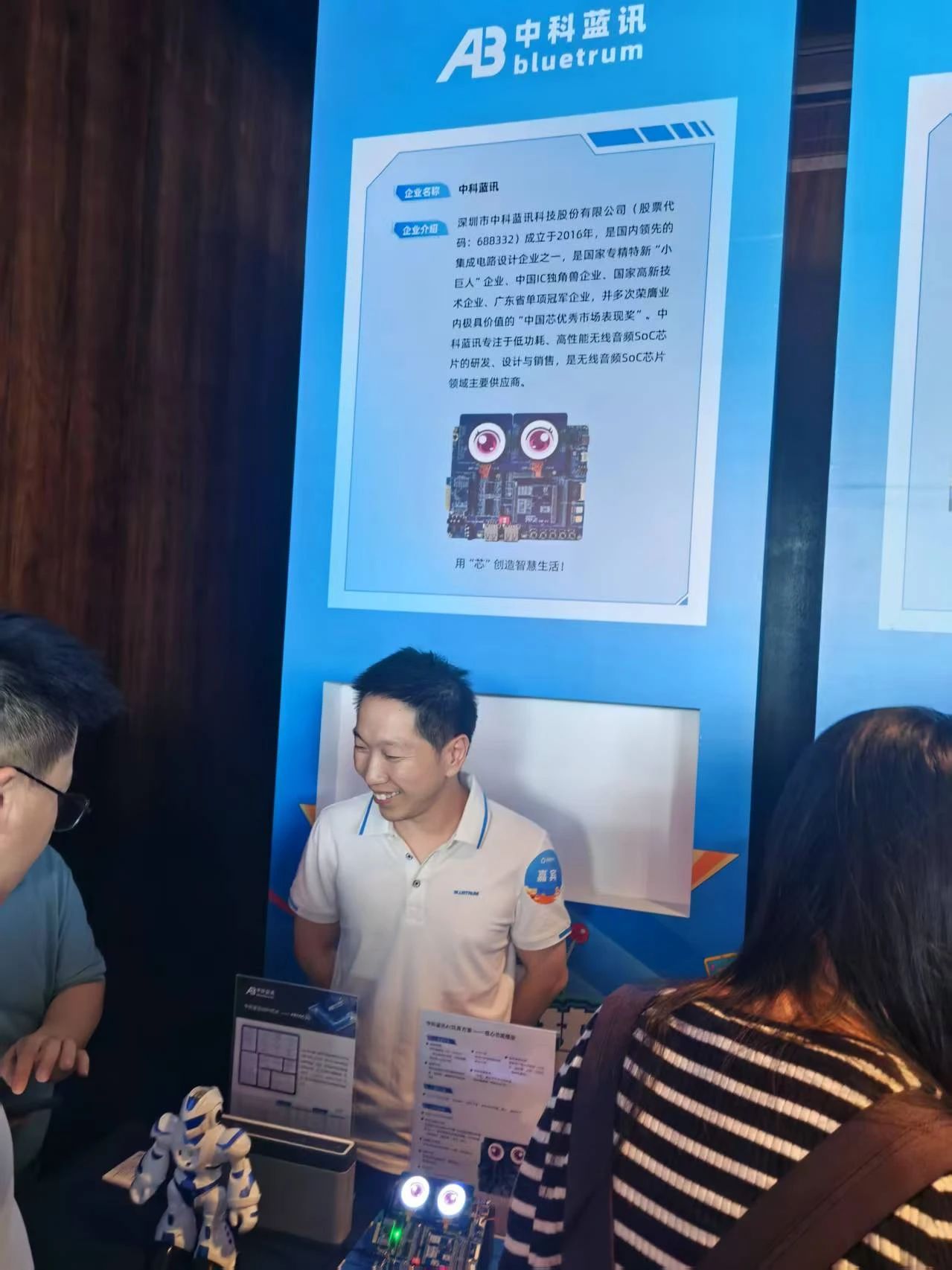 中科蓝讯工程师通过与搭载AB6003G芯片的AI机器人玩具实时对话,演示了语音唤醒、多轮对话等功能,吸引众多观众驻足体验。