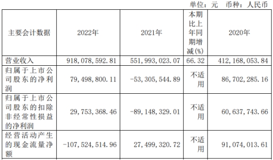 铂力特2022年实现营业收入9.18亿元,同比增长66.32%;归属于上市公司股东的净利润7949.88万元,上年同期为-5330.55万元;归属于上市公司股东的扣除非经常性损益的净利润2975.34万元,上年同期为-8914.83万元;经营活动产生的现金流量净额-1.08亿元,上年同期为2749.93万元。