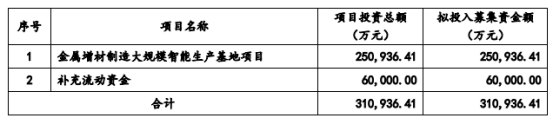 铂力特2023年4月18日披露的2022年度向特定对象发行A股股票募集说明书(申报稿)显示,公司本次向特定对象发行股票募集资金总额不超过人民币310,936.41万元(含本数),扣除相关发行费用后的募集资金净额拟用于以下项目:金属增材制造大规模智能生产基地项目、补充流动资金。