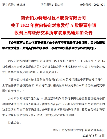 中国经济网北京5月17日讯铂力特(688333.SH)今日公告称,公司于昨日收到上交所出具的《关于西安铂力特增材技术股份有限公司向特定对象发行股票审核意见的通知》。具体意见显示,铂力特向特定对象发行股票申请符合发行条件、上市条件和信息披露要求。上交所将在履行相关程序并收到公司申请文件后提交中国证监会注册。