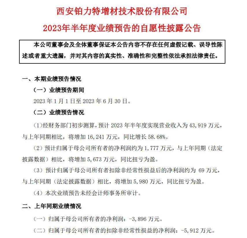 2023年7月30日,南极熊获悉,近日西安铂力特增材技术股份有限公司(以下简称“铂力特”)发布公告,披露了2023年上半年度的业绩预告。