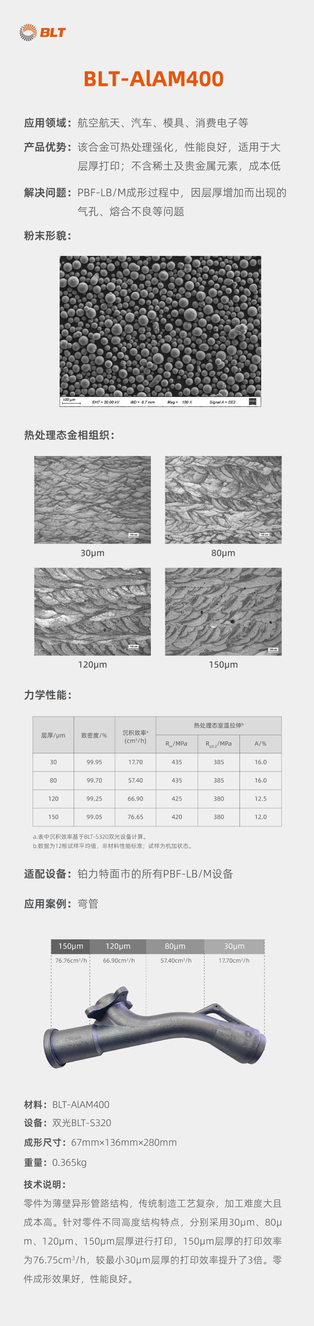 金属3D打印技术在各行业的应用不断加深,针对工业领域大规模批量生产中质量、效率和成本的痛点问题以及PBF-LB/M成形工艺特点,铂力特发布可成形铝合金材料BLT-AlAM400,适用于大层厚打印工艺,可实现零部件高效率、低成本的制造需要。