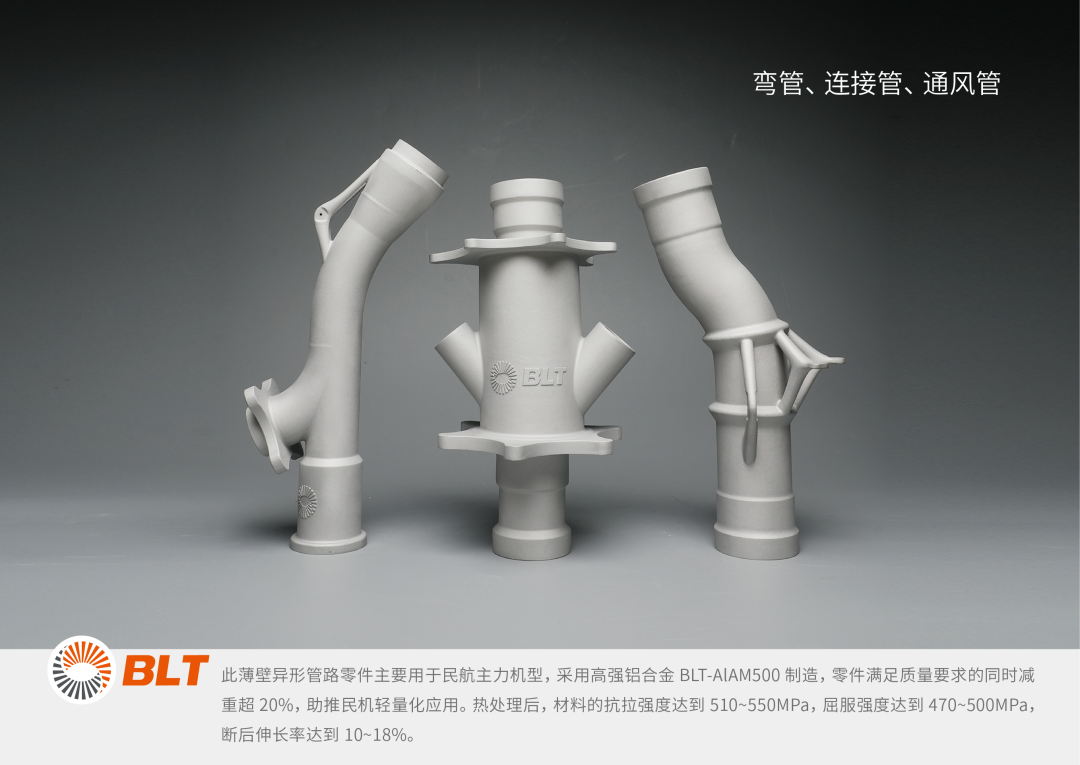 BLT-AlAM400可以平衡零件性能和制造成本,更加满足工业批产对经济效益的要求:其成分中不含稀土及贵金属元素,材料成本低;具备更好的机械加工性能,可以利用大层厚工艺生产,提高粉末利用率且显著缩短生产周期。增材制造专用材料BLT-AlAM400的制造过程中,能耗相对较低,有望实现传统铸造铝合金材料的替代。